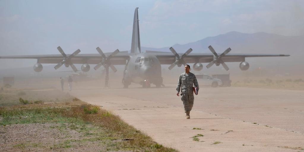 2010年4月21日,在好意思国亚利桑那州图森以南一处机场举行的2010“雷天神”军事搜救演习中,别称搜救东说念主员走在C-130运载机前。新华社记者张军摄