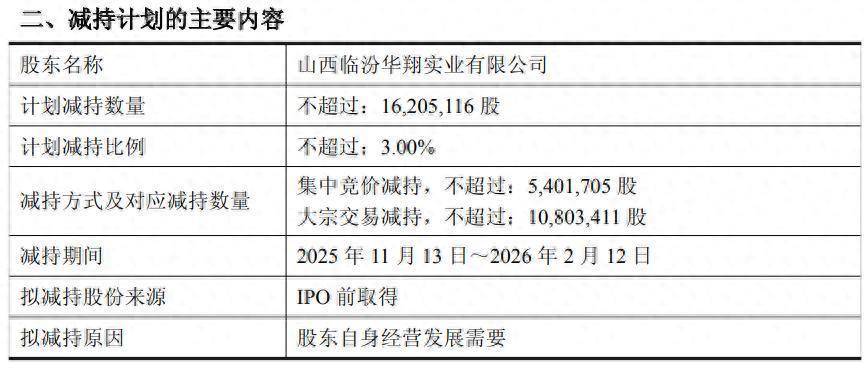 10月21日晚间,华翔股份(603112)发布公告,控股推动山西临汾华翔实业有限公司因本人计算发展需要,规划自2025年11月13日至2026年2月12日历间,通过集合竞价和大批交游步地,统共减抓不卓越1621万股,占公司总股本的3%。