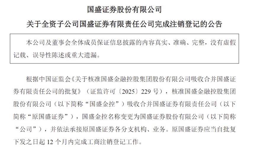 国盛证券公告称,全资子公司国盛证券有限包袱公司(下称“老国盛证券”)照旧完成刊出登记。公告自满,凭据中国证监会《对于核准国盛金融控股集团股份有限公司继承吞并国盛证券有限包袱公司的批复》(证监许可〔2025〕229号),核准国盛金控继承吞并老国盛证券,国盛金控称呼变更为国盛证券股份有限公司(即“新国盛证券”),并照章链接老国盛证券各分支机构、业务。老国盛证券应当自批复下发之日起12个月内完成工商刊出登记责任。
