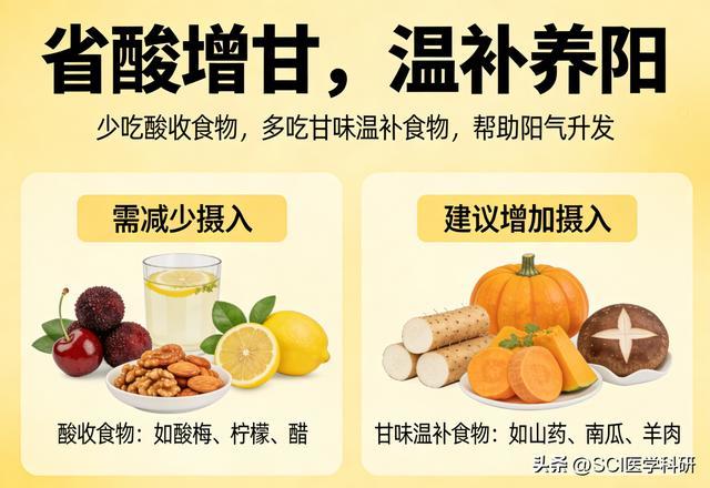 记着原则:“省酸增甘,温补养阳”。 少吃酸收的食品,多吃甘味和温补的食品,匡助阳气升发。